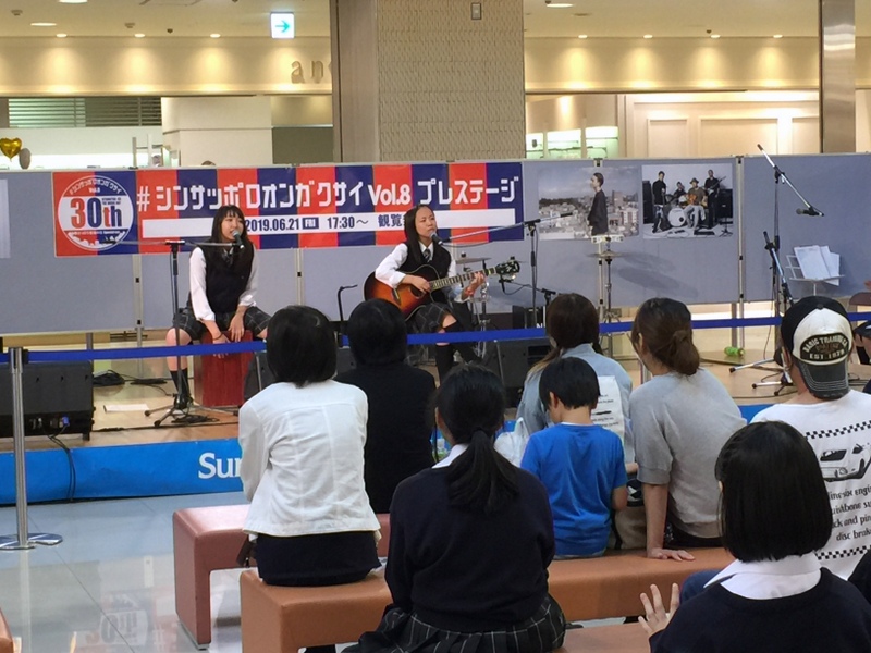 6月21日(金)17:30からサンピアザ光の広場にて、厚別高校軽音楽部のEaT Me が「新さっぽろ音楽の日」の本祭に向けてPRイベントプレステージに出演しました。また、演奏だけでなく司会進行、チケット販売なども厚別高校軽音楽部が担当するなど、多くの部員がサポートしました。たくさんの買物をしている方々に向けて3曲を演奏しました。3月にも同じステージで演奏した経験もあり、お客さんと楽しむことができたステージとなりました。本祭にはぜひ多くの方々が来場していただけることを期待しています。